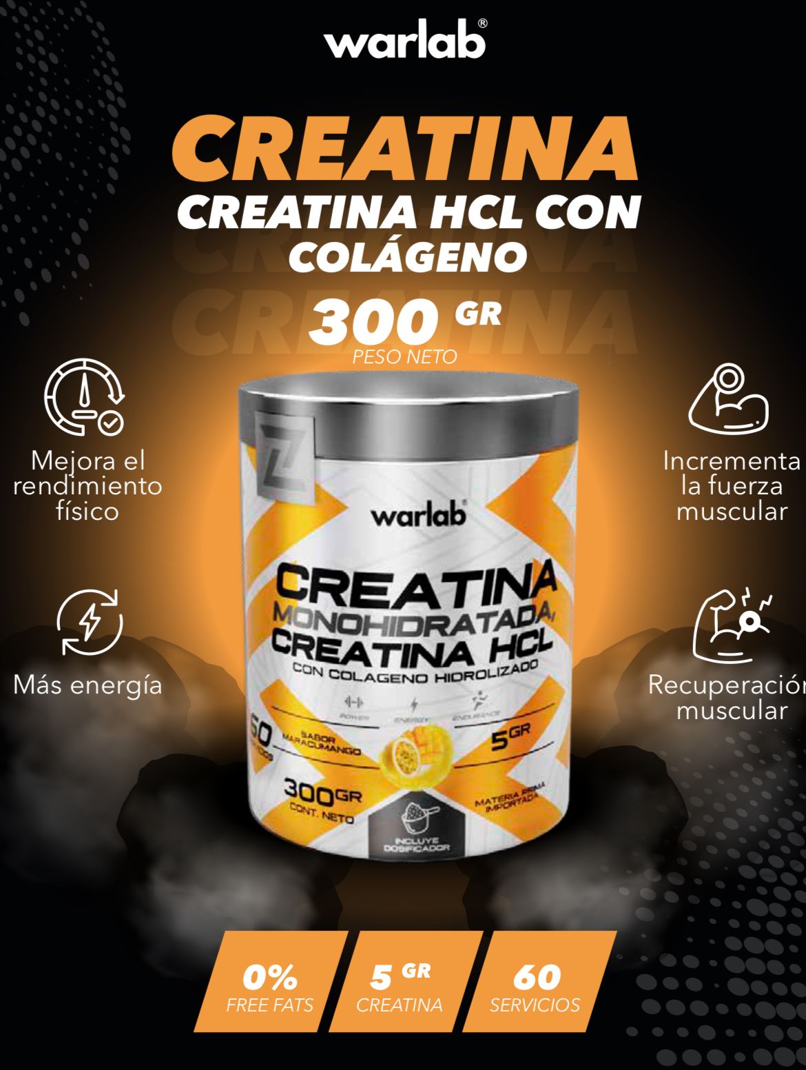 La Creatina Warlab es un suplemento deportivo avanzado que combina Creatina Monohidratada y Creatina HCL, enriquecido con Colágeno Hidrolizado. Está diseñado para atletas que buscan maximizar su potencia, acelerar la recuperación y proteger sus articulaciones en un solo producto.