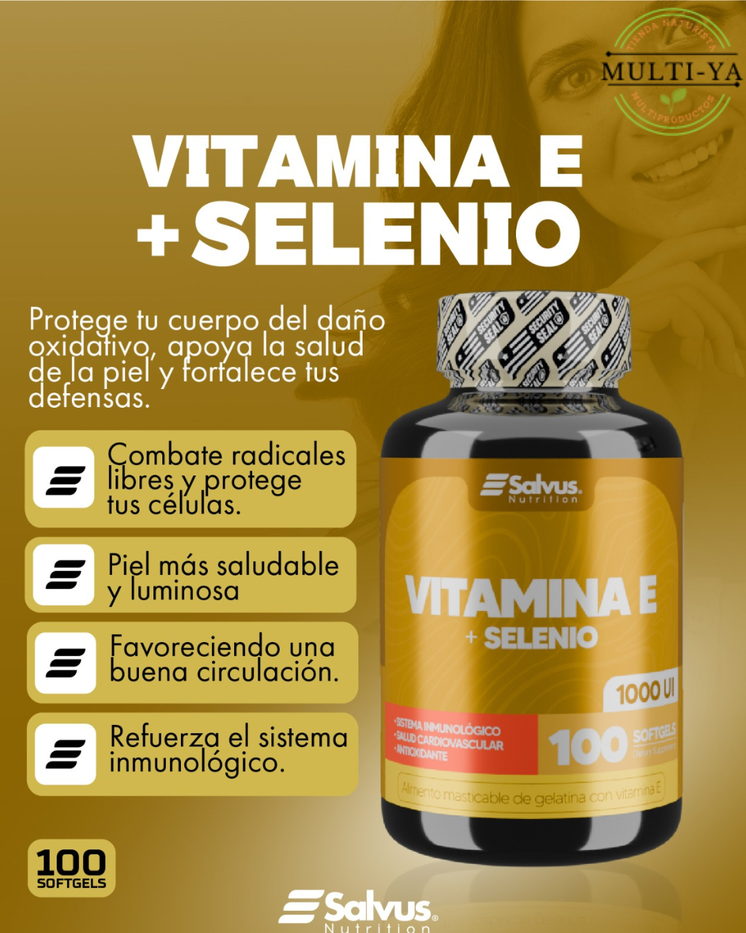 Lucha contra Radicales Libres: Este es el beneficio primordial. La Vitamina E es uno de los antioxidantes liposolubles más importantes, protegiendo las membranas celulares del daño. El Selenio ayuda a reciclar la Vitamina E, potenciando su efecto.